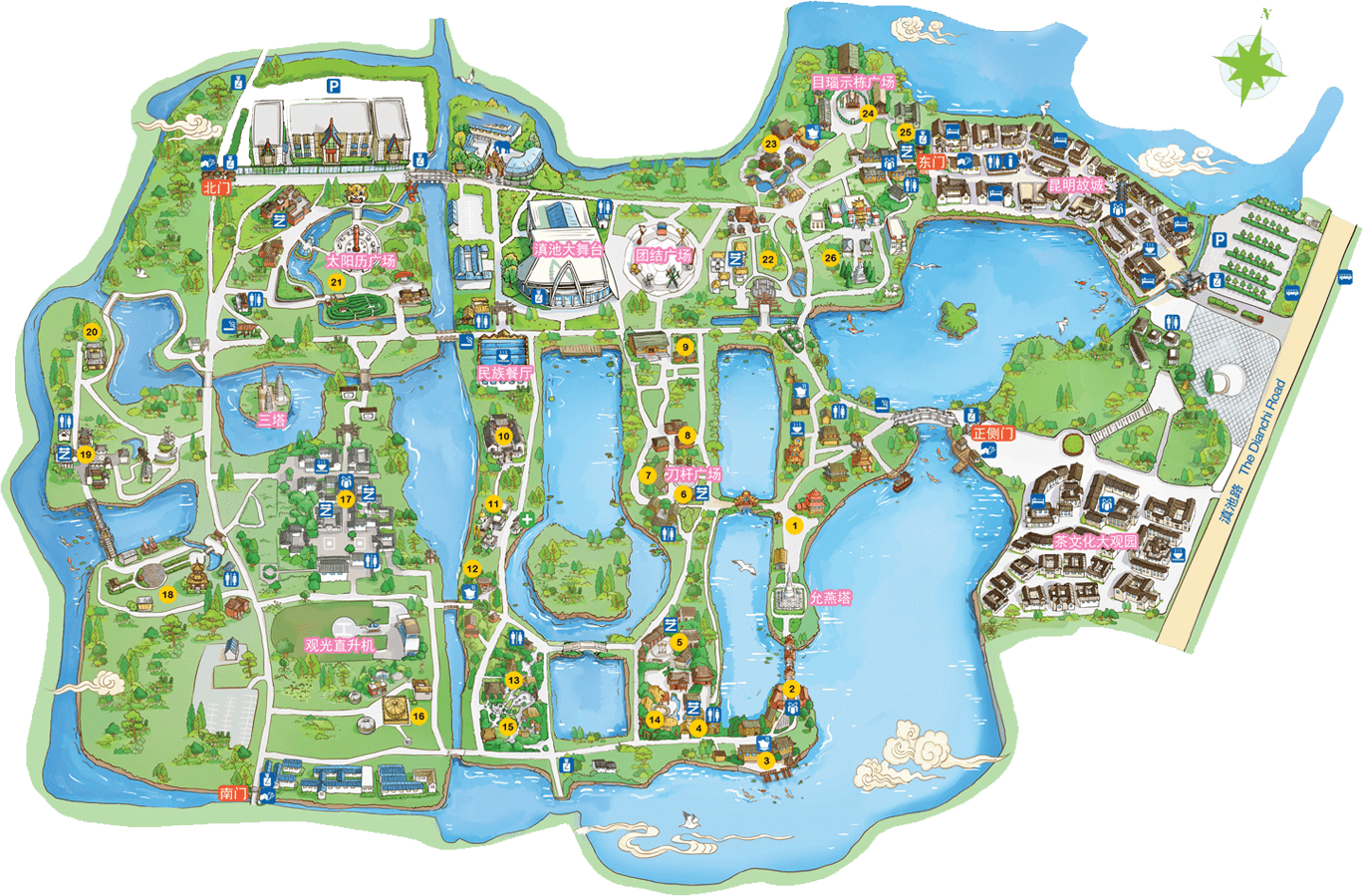 佤族人口約36萬,主要聚居在云南省瀾滄江南段以西的阿佤山區(qū)。佤族寨位于“翠漪洲”東南角。寨內(nèi)分布有茅草頂?shù)母蓹谑浇ㄖ骸⑴n^廣場、神靈廣場、司崗里石雕以及糧倉等。牛頭廣場是佤族古老的剽牛活動場所,場正中的牛角為佤族的寨樁,廣場前的兩個(gè)石人分別為佤族的男性和女性祖先。神靈廣場表現(xiàn)了佤族萬物有靈、靈魂不死的自然崇拜觀念。場中兩個(gè)石人雕像分別為佤族最崇拜的“木依吉”和“阿依娥”。佤族木鼓舞節(jié)拍鮮明強(qiáng)烈,...